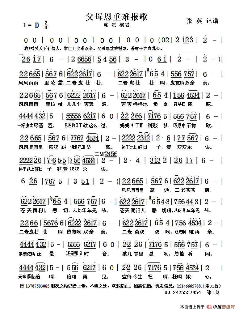 二胡乐谱曲谱 我的祖国(二胡二重奏 影片《上甘岭