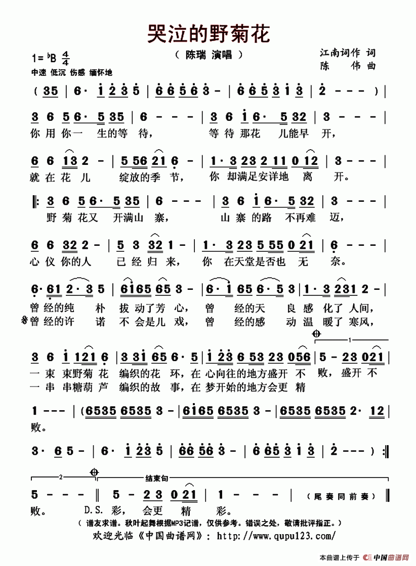 二胡乐谱曲谱 松花江上(张寒晖曲 王莉莉订谱)