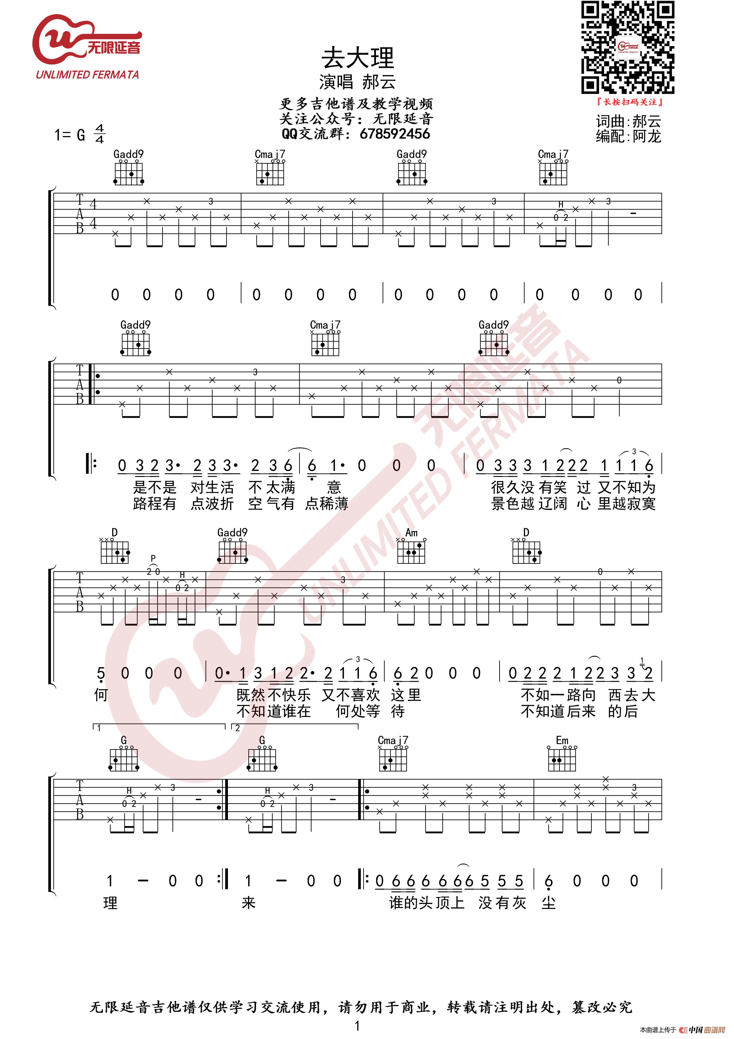 去大理吉他谱 郝云(无限延音编配)