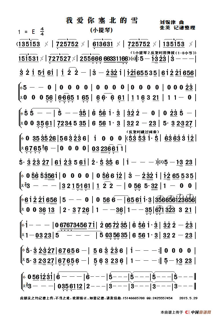 我爱你塞北的雪(纯音乐、小提琴版简谱)