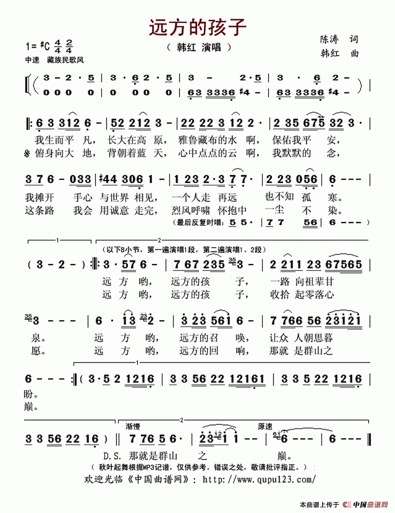 远方的孩子(陈涛词 韩红曲)