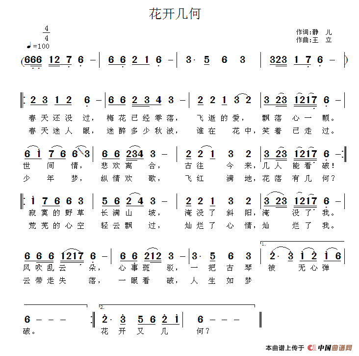 花开几何简谱 静儿词 王立曲 通俗曲谱 中国曲谱网