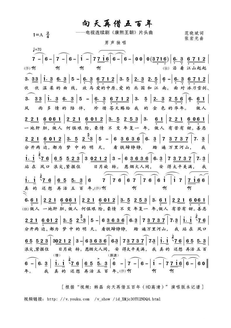 向天再借五百年简谱 电视剧 康熙王朝 主题曲 亦天 一叶知秋 个人制谱园地 中国曲谱网