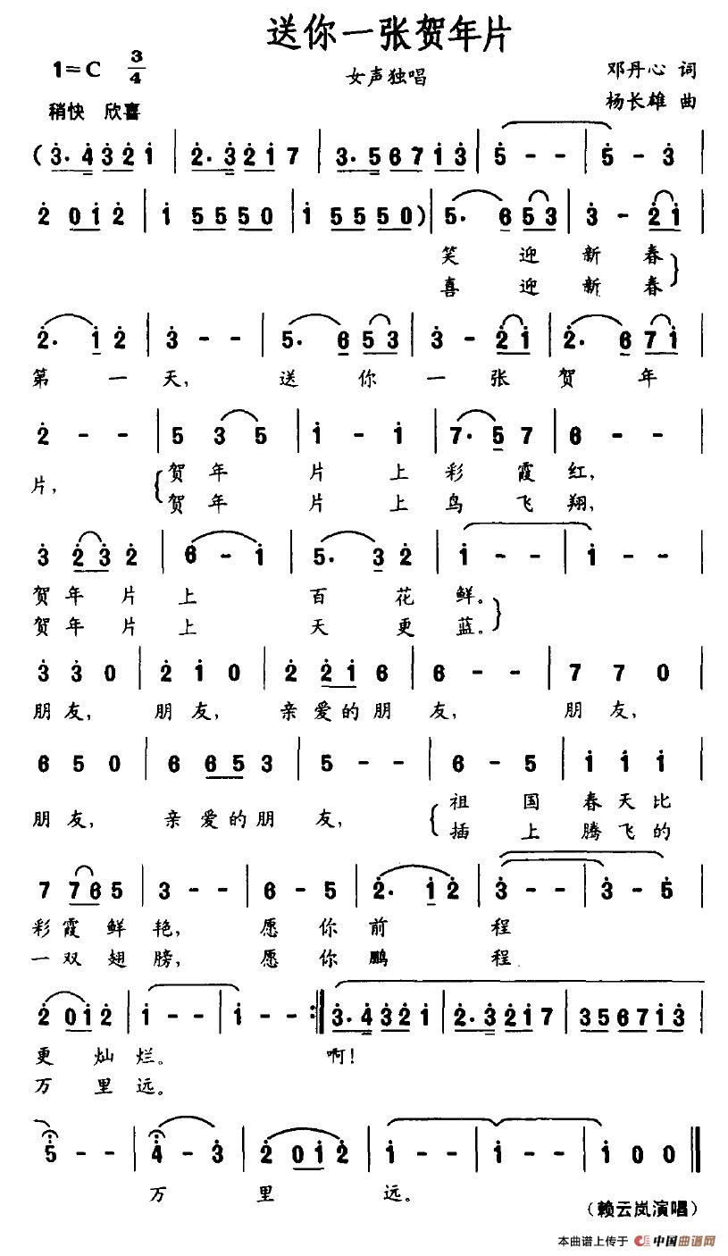 送你一张贺年片简谱 民歌曲谱 中国曲谱网