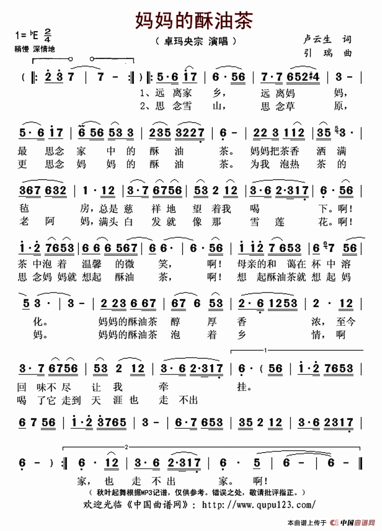 妈妈的酥油茶简谱 卢云生词 引瑞曲 秋叶起舞个人制谱园地 中国曲谱网