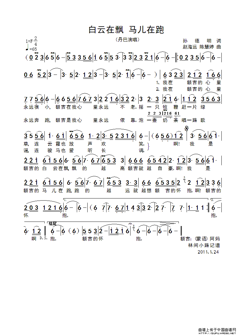 白云在飘 马儿在跑简谱 谱友园地 中国曲谱网