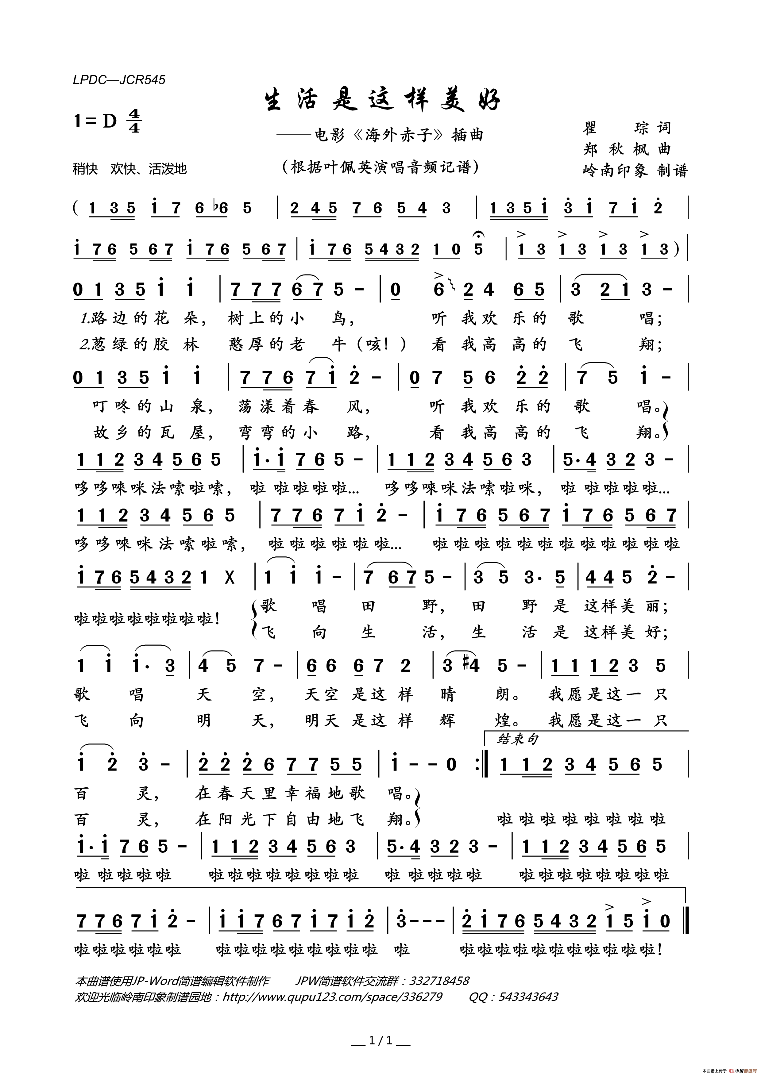 生活是这样美好简谱 电影 海外赤子 插曲 岭南印象个人制谱园地 中国曲谱网