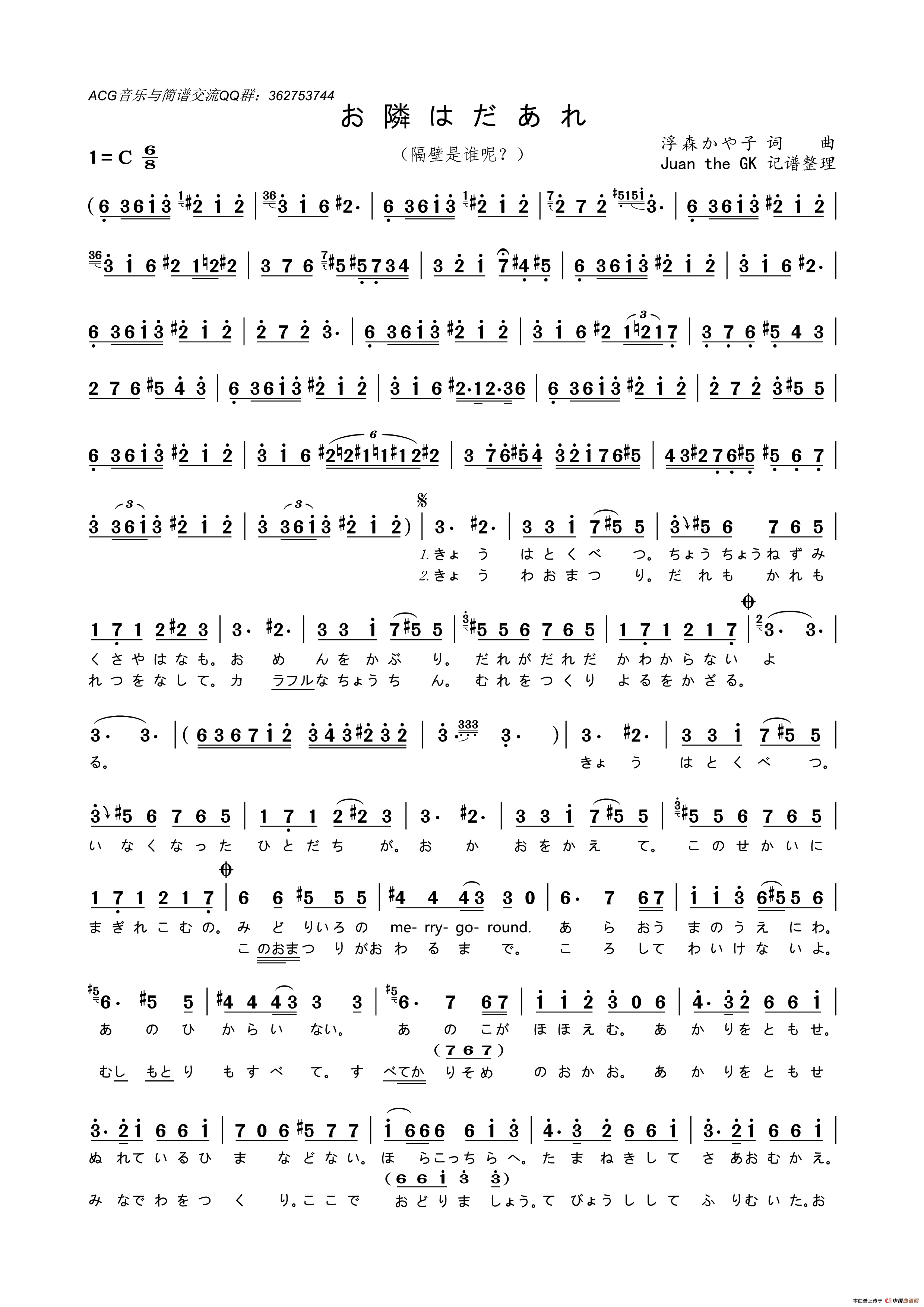 お隣はだあれ简谱 隔壁是谁呢 门酱胡安个人制谱园地 中国曲谱网