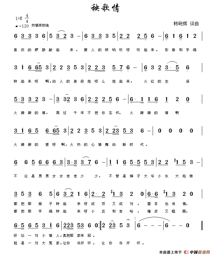 秧歌情简谱 韩晓辉 词曲 民歌曲谱 中国曲谱网