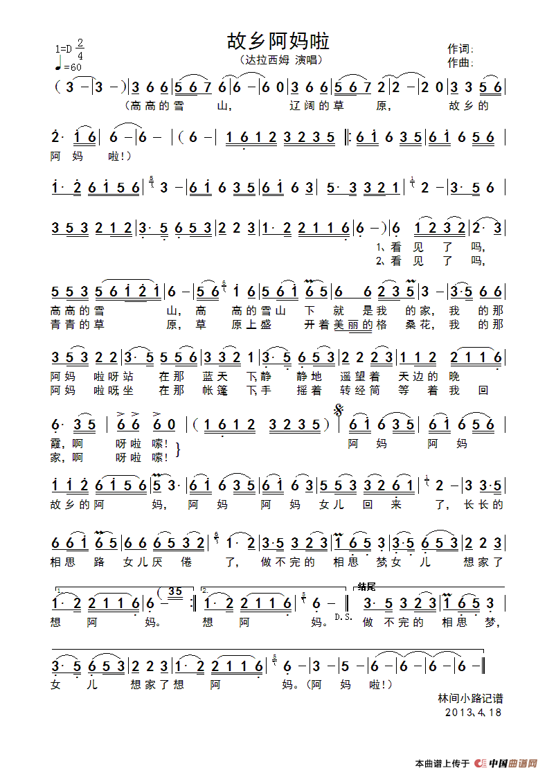 阿妈的笑脸 视频 呼斯楞 阿妈的笑脸 KTV 演唱版本 简谱图片格式