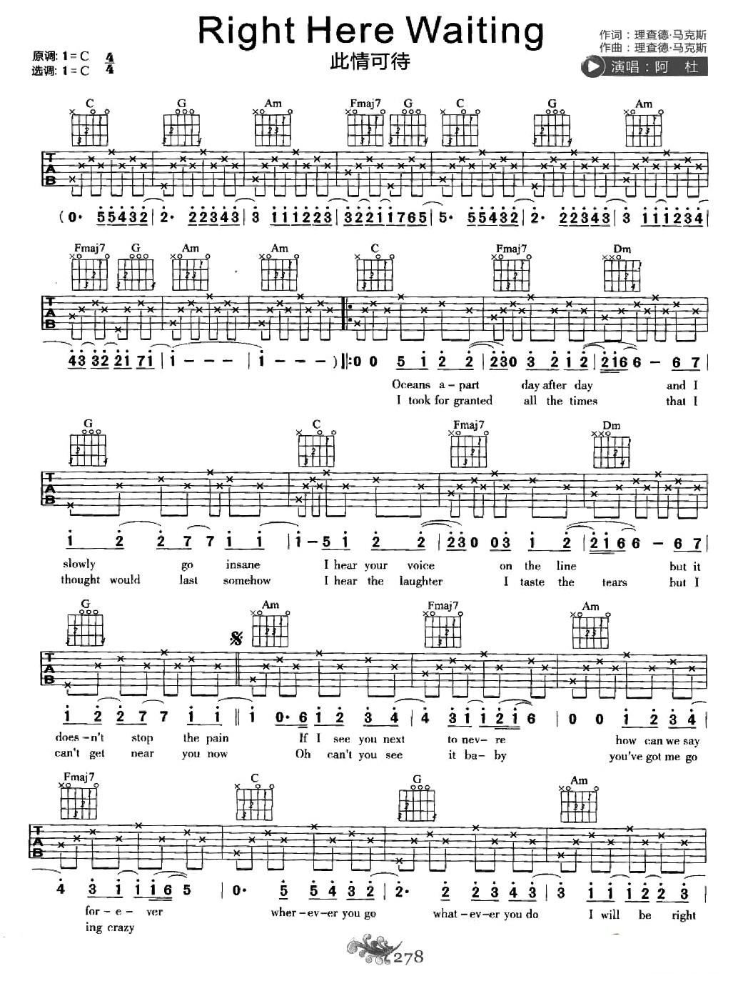 民谣吉他英文经典系列 四 Richard Marx Right Here Waiting 此情可待 民谣吉他弹唱