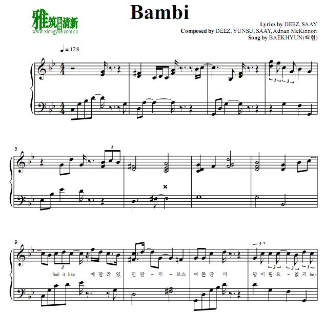 伯贤 Bambi歌谱 弹唱钢琴谱
