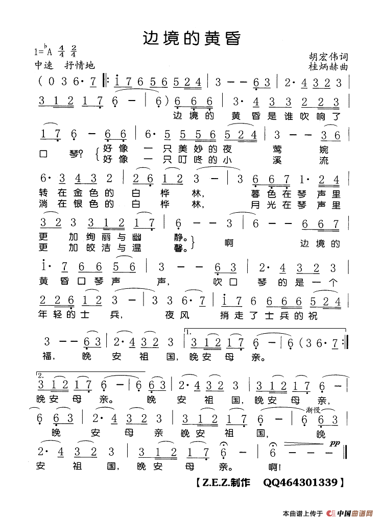 边境的黄昏简谱 陈克正词 刘虹曲 民歌曲谱 中国曲谱网