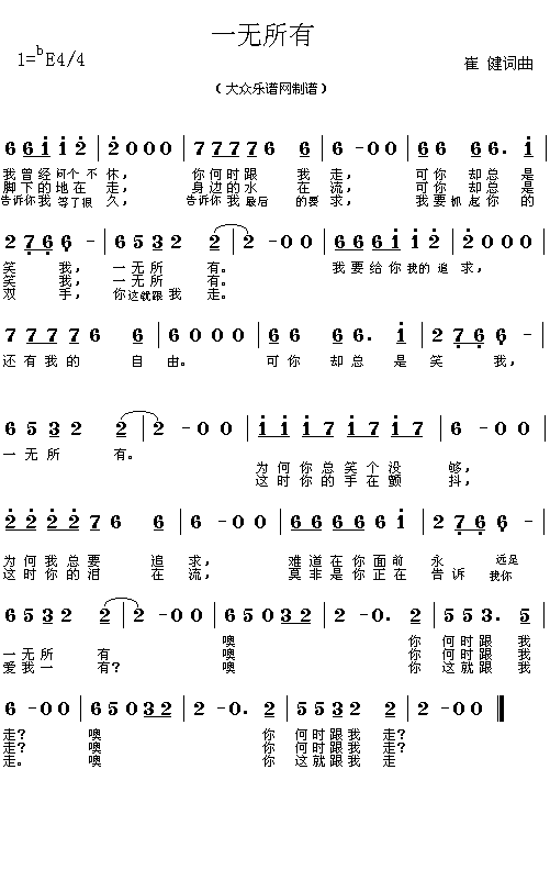 一无所有 乐队总 一无所有 乐队总 简谱 一无所有 乐队总 吉他谱 钢琴谱 查字典简谱网