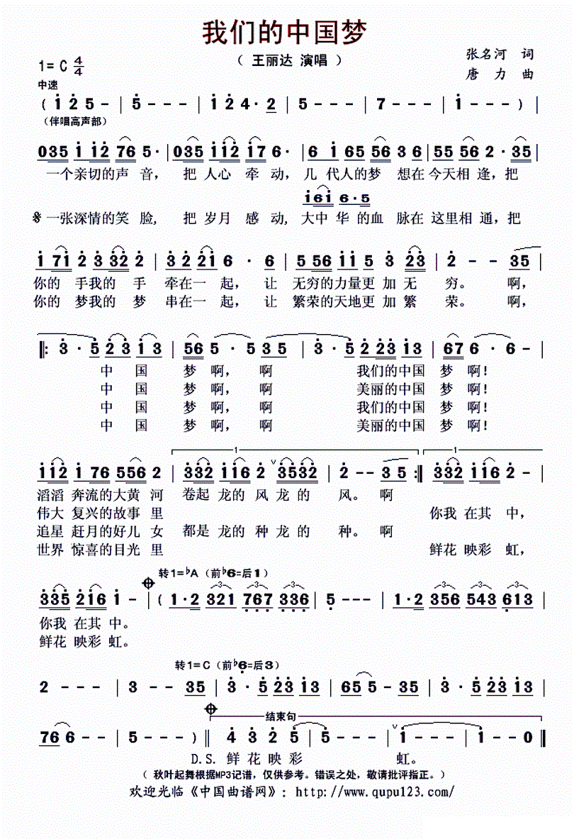 中国梦简谱 张攀峰词 常继红曲 民歌曲谱 中国曲谱网