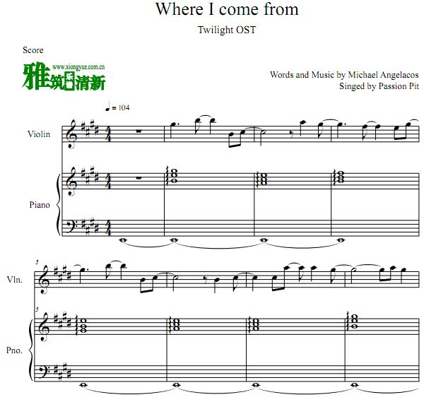 暮光之城 破晓下 Where I Come From小提琴钢琴二重奏谱