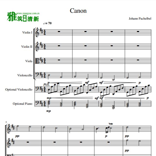 D大调卡农弦乐四重奏谱 钢琴伴奏