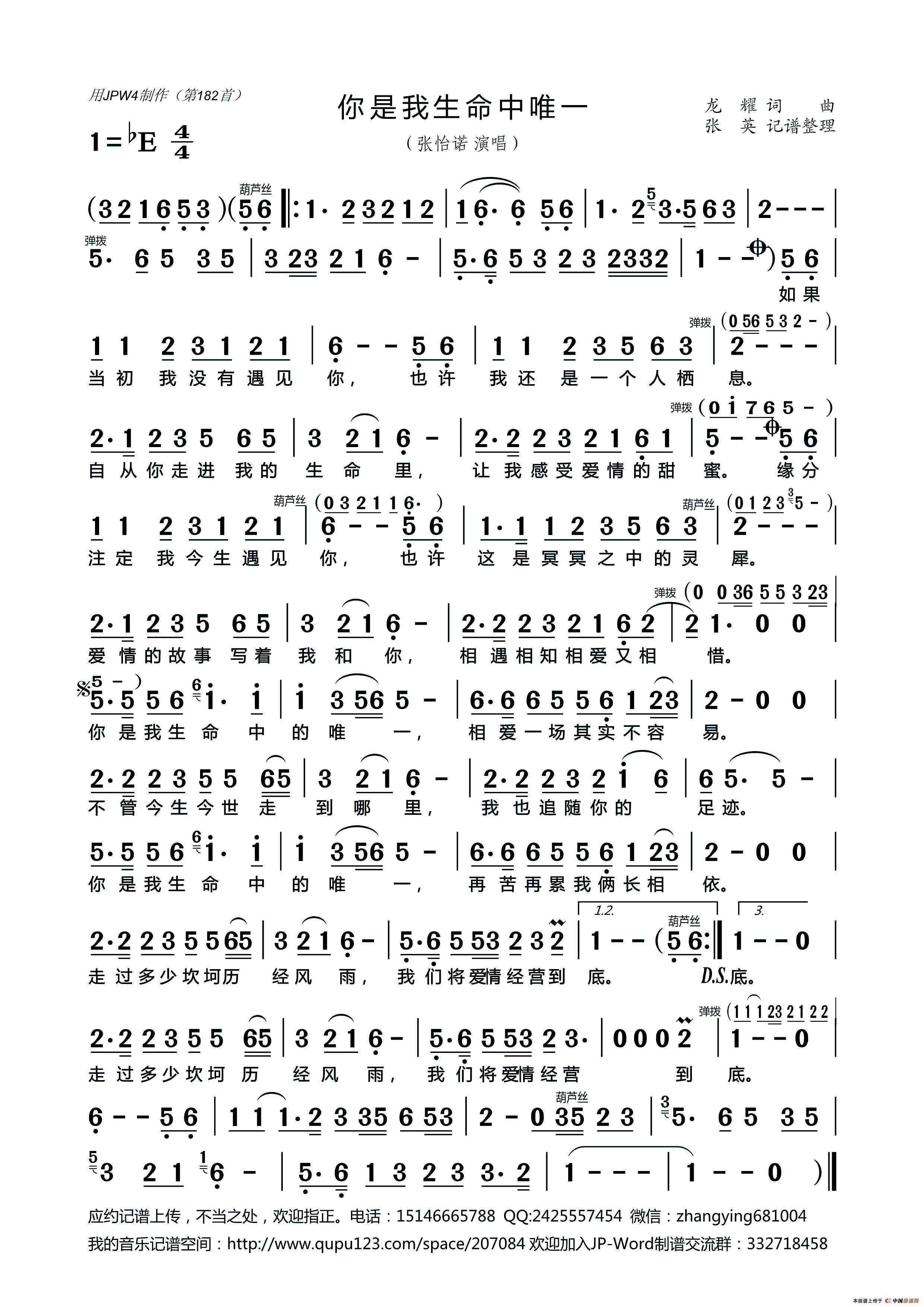 你是我生命中的唯一简谱 张英681004个人制谱园地 中国曲谱网