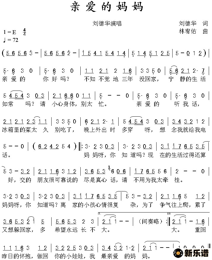 亲爱的妈妈 简谱 刘德华 刘德华钢琴谱吉他谱 www.xinyuepu.com 新乐谱