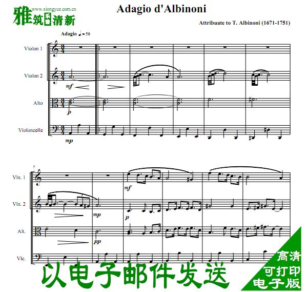albinoni 阿尔比诺尼 G小调柔板弦乐四重奏改编版C调谱 adagio