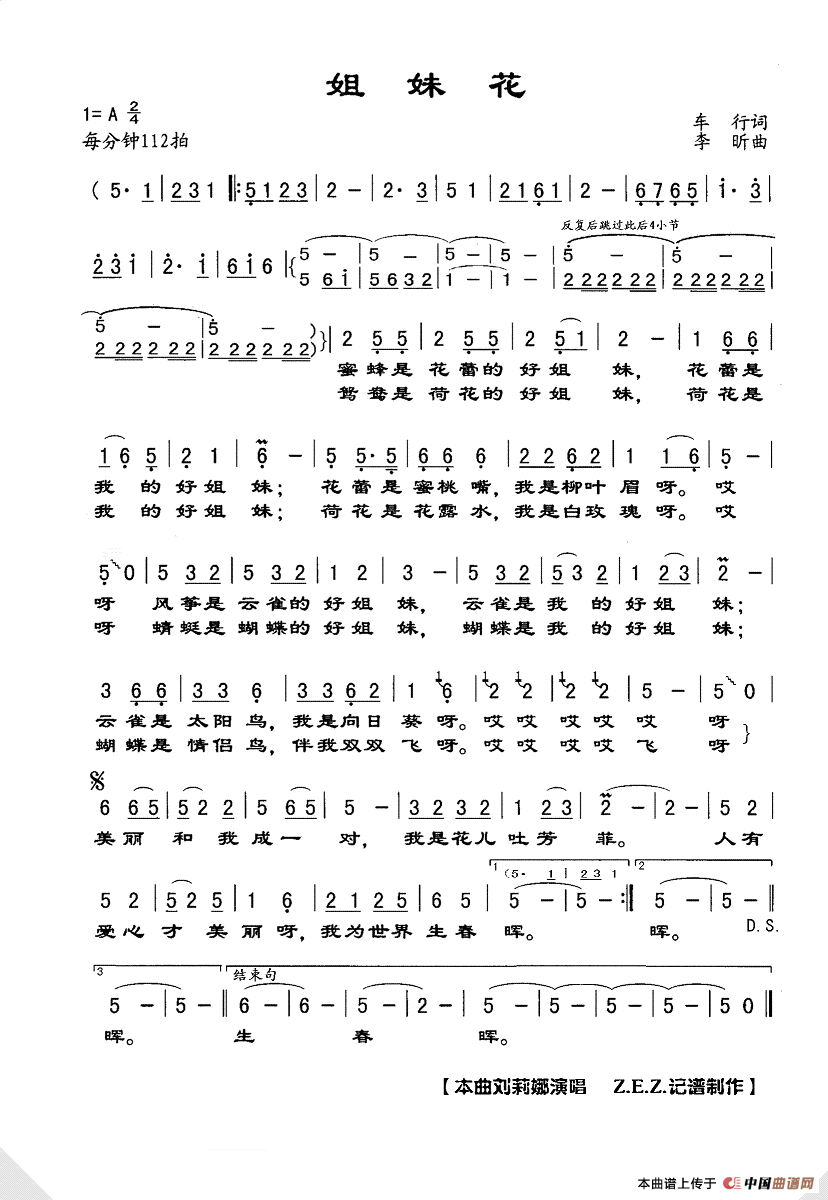 姐妹花简谱 车行词 李昕曲 Z.E.Z.个人制谱园地 中国曲谱网