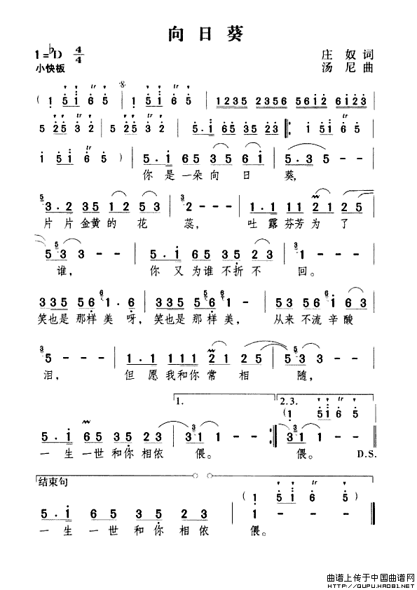 向日葵简谱 庄奴词 汤尼曲 通俗曲谱 中国曲谱网