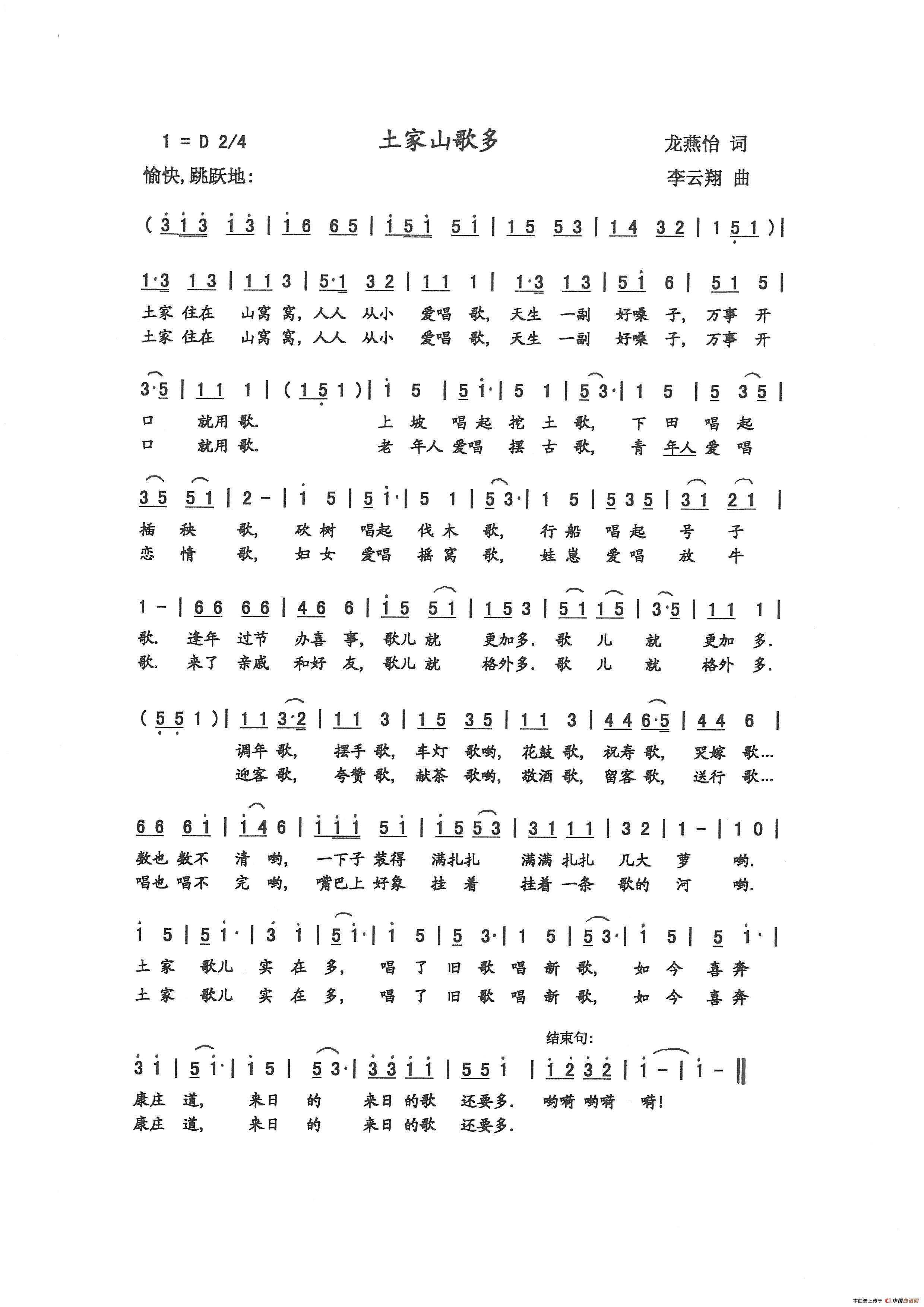 土家山歌多简谱 龙燕怡 词 李云翔 曲 李云翔原创曲谱专栏 中国曲谱网