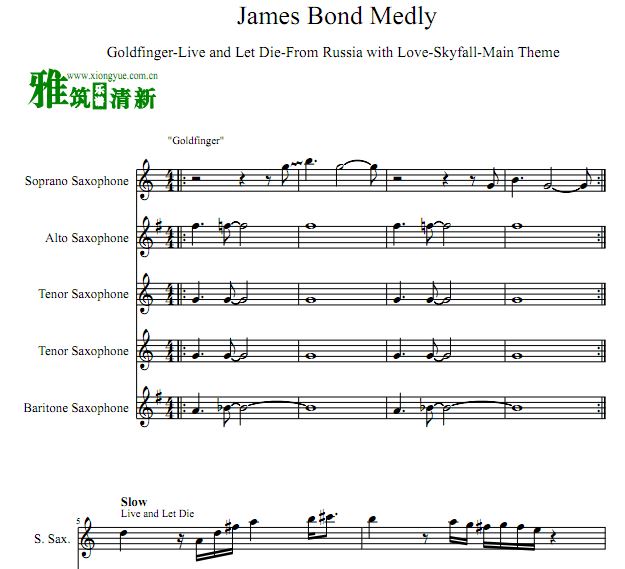 James Bond Medly 007电影插曲串烧萨克斯五重奏谱
