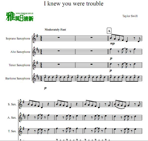 I knew you were trouble萨克斯四重奏谱