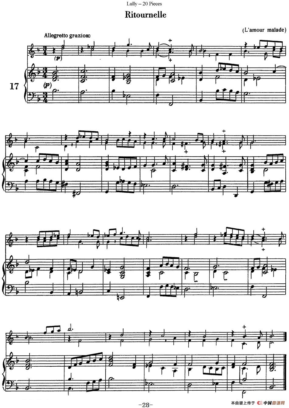 卢黎20首长笛附带钢琴伴奏曲长笛谱该歌谱演奏者为Jean Baptiste Lully (卢黎),歌曲名称为卢黎,歌谱类型为长笛谱。长笛是现代管弦乐和室乐中主要的高音旋律乐器,外型是一根开有数个音孔的圆柱型长管。早期的长笛是乌木或者椰木制,现代多使用金属的材质,比如比较低级的黄铜、白铜,普通的镍银合金到专业型的银合金,9K、14K、18K、20K、24K金和铂金长笛等。