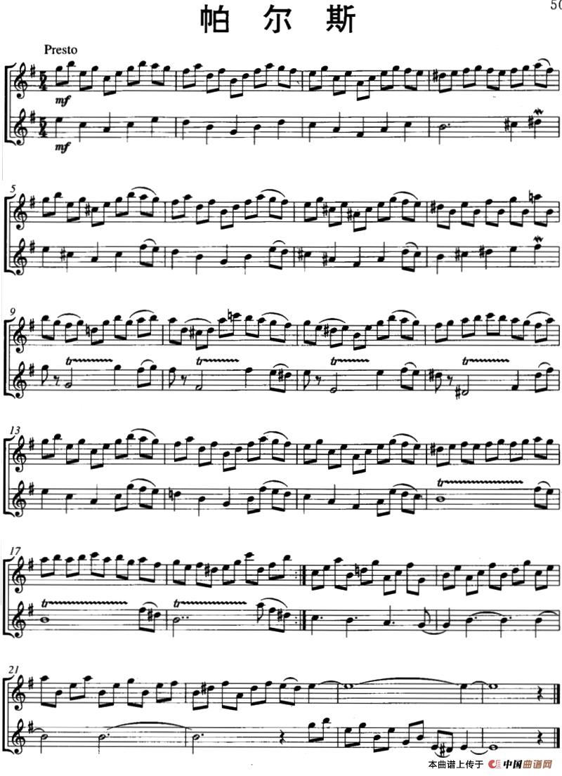 帕尔斯(Puls)(二重奏)长笛谱该歌谱演奏者为长笛,歌曲名称为帕尔斯,歌谱类型为长笛谱。长笛是现代管弦乐和室乐中主要的高音旋律乐器,外型是一根开有数个音孔的圆柱型长管。早期的长笛是乌木或者椰木制,现代多使用金属的材质,比如比较低级的黄铜、白铜,普通的镍银合金到专业型的银合金,9K、14K、18K、20K、24K金和铂金长笛等。音质动感而好听,声音婉转而悠扬。长笛很考验吹奏者的气息控制,要找到一个合适的切入点,才能吹出近乎完美的音律。