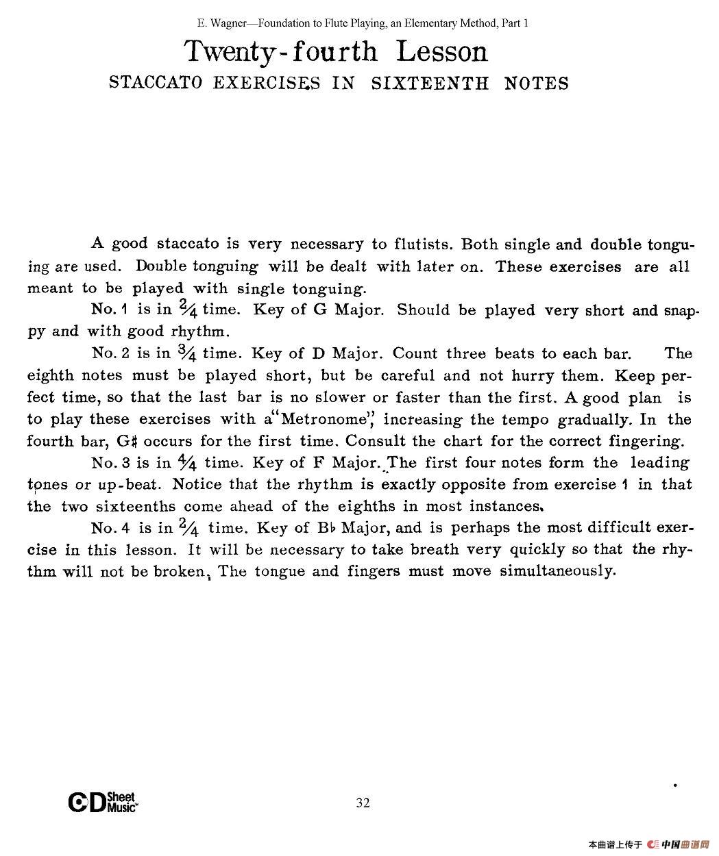 长笛演奏基础教程练习(21—30)长笛谱该歌谱演奏者为E·Wagner (E·韦格),歌曲名称为长笛演奏基础教程练习(21—30),歌谱类型为长笛谱。长笛是现代管弦乐和室乐中主要的高音旋律乐器,外型是一根开有数个音孔的圆柱型长管。早期的长笛是乌木或者椰木制,现代多使用金属的材质,比如比较低级的黄铜、白铜,普通的镍银合金到专业型的银合金,9K、14K、18K、20K、24K金和铂金长笛等
