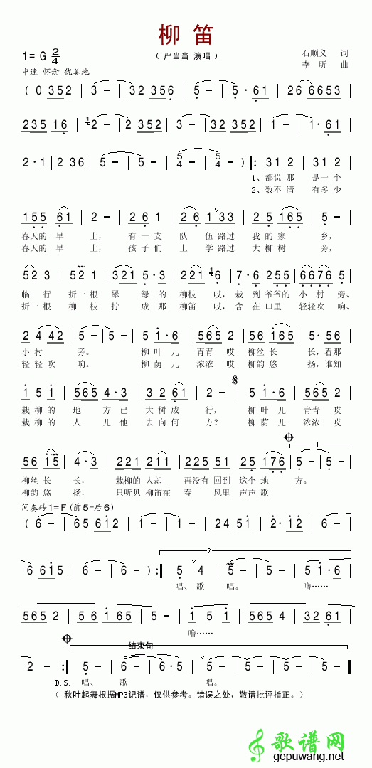 严当当演唱:柳笛 G调 笛子简谱 石顺义词李昕曲