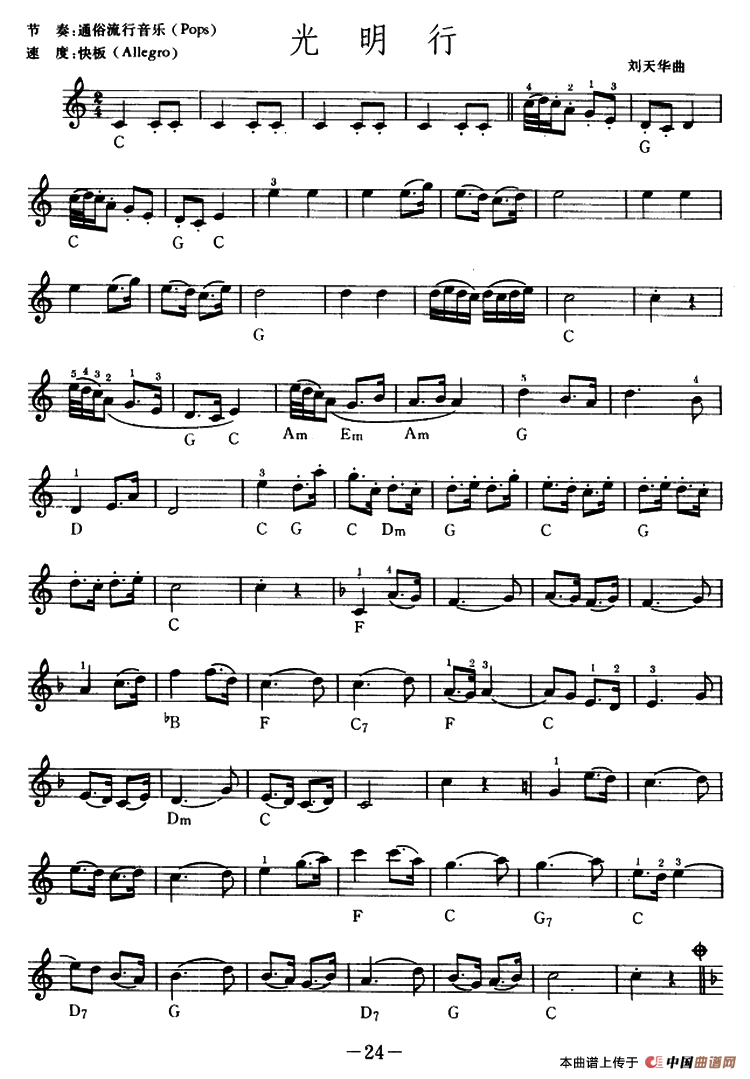 :光明行(箫)笛箫谱该歌谱演奏者为刘天华,歌曲名称为光明行,歌谱类型为。器乐曲《光明行》是刘天华于1931年春创作的一首二胡独奏曲,是一首振奋人心的进行曲。乐曲气势恢宏,旋律明快坚定,节奏富于弹性。刘天华创作此曲时曾说:“因外国人都谓我国音乐萎靡不振,故作此曲以证其误”用主和弦的分解进行构成的号角式音调,在乐曲中占主导的地位。作者在这首乐曲中首次用了功能性很强的五度关系的转调,调性明亮,音区的递换也极富色彩,全曲讴歌了追求光明的勇士和他们所追求的光明。