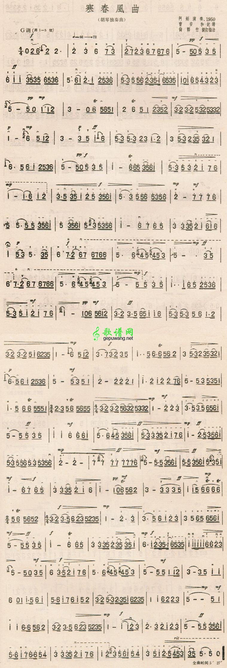 寒春风曲二胡曲谱(阿炳:二胡)