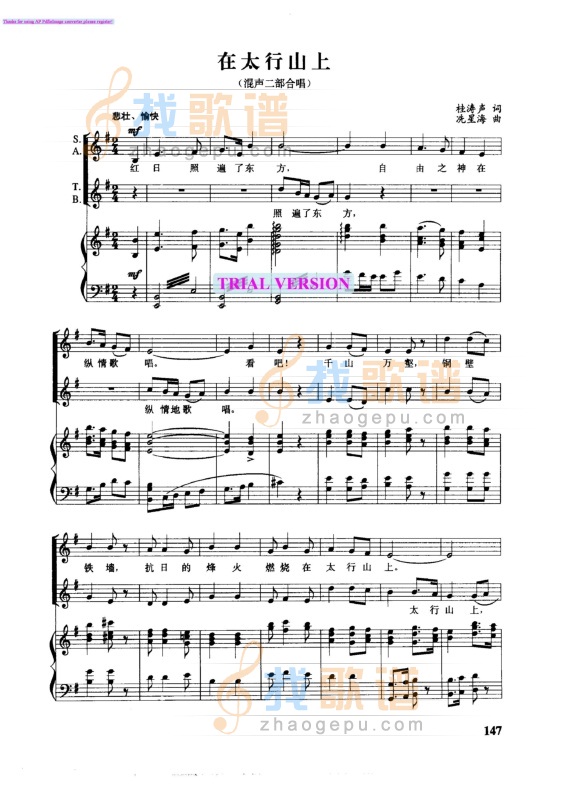 :在太行山上(五线谱/简谱对照)简谱该歌谱演奏者为冼星海,歌曲名称为在太行山上,歌谱类型为。《在太行山上》,抗战老歌,桂涛声词,冼星海曲。1938年7月,由张曙、林路、赵启海等在武汉纪念抗战一周年歌咏大会上唱出,迅速传遍大后方及各敌后抗日根据地。在太行山上简谱