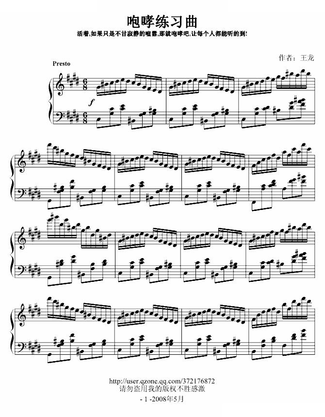 咆哮练习曲钢琴谱该歌谱演奏者为龙哥们 ,歌曲名称为咆哮练习曲,歌谱类型为钢琴谱。咆哮练习曲是由王龙创作的。