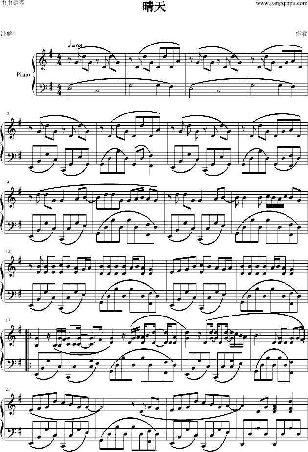 晴天 钢琴谱该歌谱演奏者为周杰伦,歌曲名称为晴天,歌谱类型为钢琴谱。《晴天》是由中国台湾男歌手周杰伦填词、谱曲并演唱的歌曲,收录于其2003年7月31日发行的专辑《叶惠美》中。2003年,获得“第十届全球华语音乐榜”港台地区最佳歌曲奖[1] 。2005年,获得“第四届全球华语歌曲排行榜”年度最受欢迎金曲奖[2] 。