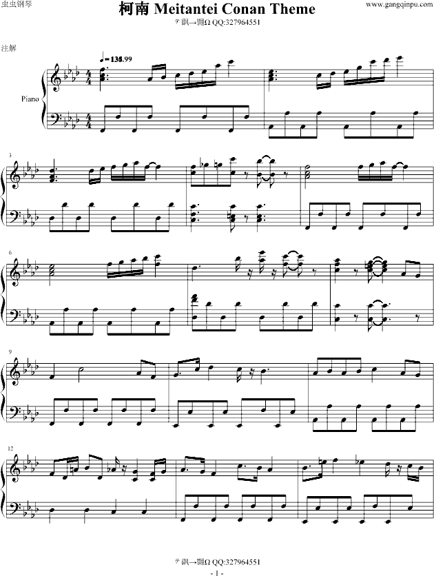 柯南经典插曲钢琴谱该歌谱演奏者为插曲,歌曲名称为柯南经典插曲,歌谱类型为钢琴谱。《名侦探柯南》是根据日本漫画家青山刚昌创作的侦探漫画《名侦探柯南》改编的同名推理动画作品系列。其中电视动画由V1 Studio制作,于1996年1月8日开始在日本读卖电视台播放,至今仍在播出。