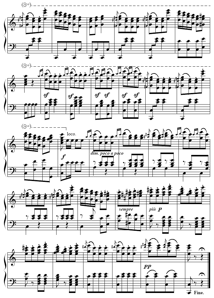 紧接者的第三小乐段也是有几乎是十六分音符构成的快速旋律,顺者第二小段的旋律一泻而来,不可阻挡。