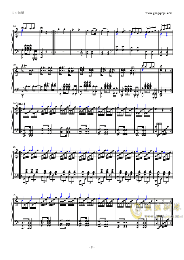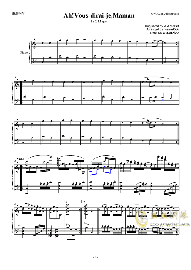 小星星变奏曲【炫技再变奏】钢琴谱该歌谱演奏者为莫扎特,歌曲名称为小星星变奏曲,歌谱类型为钢琴谱。《小星星变奏曲》为C大调作品第K. 265/300e由莫扎特于1778年所创作的钢琴曲。原题直译的意思为在法国歌曲《妈妈请听我说》基础上创作的12段变奏曲。