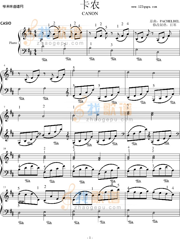卡农-(带指法超简单版)-帕赫贝尔-Pachelbel钢琴谱该歌谱演奏者为Pachelbel,歌曲名称为卡农,歌谱类型为钢琴谱。D大调卡农与吉格(德语:Kanon und Gigue in D-Dur für drei Violinen und Basso Continuo),也称约翰·帕赫贝尔卡农(Pachelbel's Canon),是德国作曲家约翰·帕赫贝尔最著名的作品。因为它是最著名的卡农乐曲,有时也常以“卡农”代指。然而实际上卡农(Canon)并非曲名,而是一种曲式。卡农在字面上是“轮唱”的意思,吉格(Gigue)则是舞曲。D大调卡农作于1680年前后,是巴洛克时期的室内乐作品,采用数字低音手法,供三个小提琴演奏。它曾被改编为多个不同版本,供不同乐器组合演奏。它原有吉格舞曲伴随,但现在很少演奏这段。