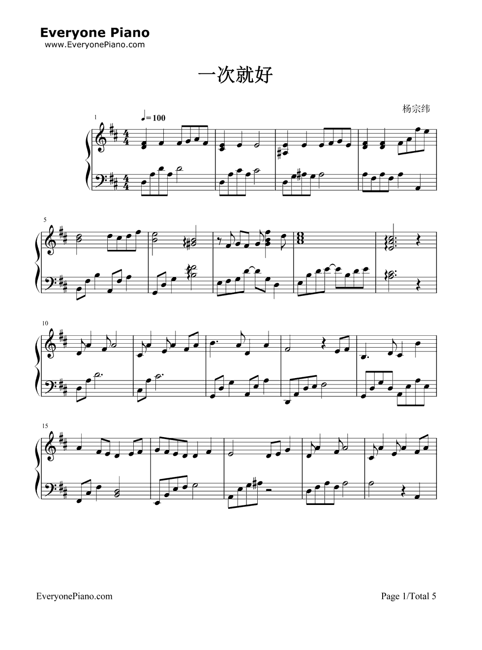 《一次就好》(杨宗纬演唱)钢琴谱
