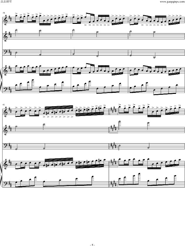 帕赫贝尔(Johann Pachelbel)的《D大调卡农》(Canon and Gigue in D),也称作《帕赫贝尔的卡农》(Pachelbel's Canon),作品编号:T。 337。通常人们更多地关注作品的第一部分卡农,(Pachelbel's Canon)。此曲一般的演奏法是以大提琴启奏,三把小提琴间隔八拍先后加入。小提琴全部拉奏完全相同旋律,前后仅三段不同的旋律,每段仅两小节的旋律供重复拉奏;大提琴从头到尾也仅有两小节,重复达二十八次之多。这段音乐虽然不断回旋往复,但其旋律之美不让人觉得单调,反而感觉动听悦耳。