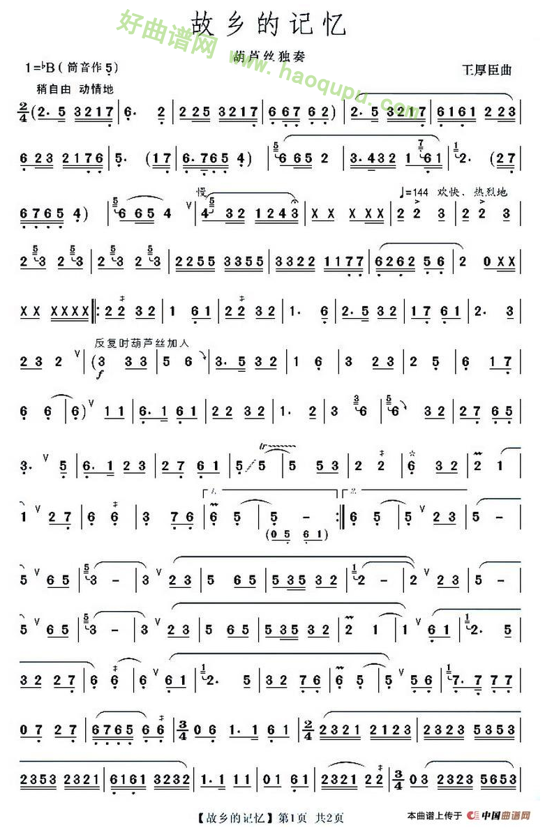 葫芦丝乐谱曲谱 牧歌(巴乌独奏 李镇曲)
