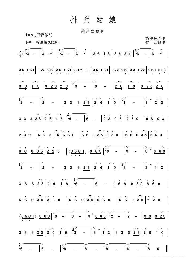 葫芦丝乐谱曲谱 排角姑娘(葫芦丝独奏 哈尼族民族风)