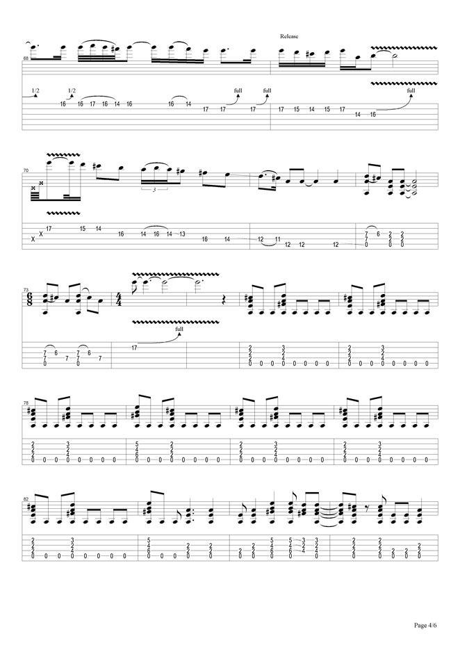 ,歌曲名称为Hammer to Fal,歌谱类型为吉他谱。是世界上通用的一种专为吉他设计的记谱方法。我们在学习吉他,特别是弹唱和指弹时,接触最多的也是它。六线谱的基本结构是由六根间隔相等的线组成,这六根线分别代表吉他上的六根弦,最下面的一条线,代表吉他的第六根弦,注意,是第六,不是第一,这个要反过来理解的,然后依次是由上到下看谱,倒数第二根线代表第五根弦,下面的依次类推。所以,六线谱上最上面一根代表高音E弦,也就是1弦,接下来以此是2弦(B弦)到6弦(低音E弦)。六线谱的读法是从左往右读的