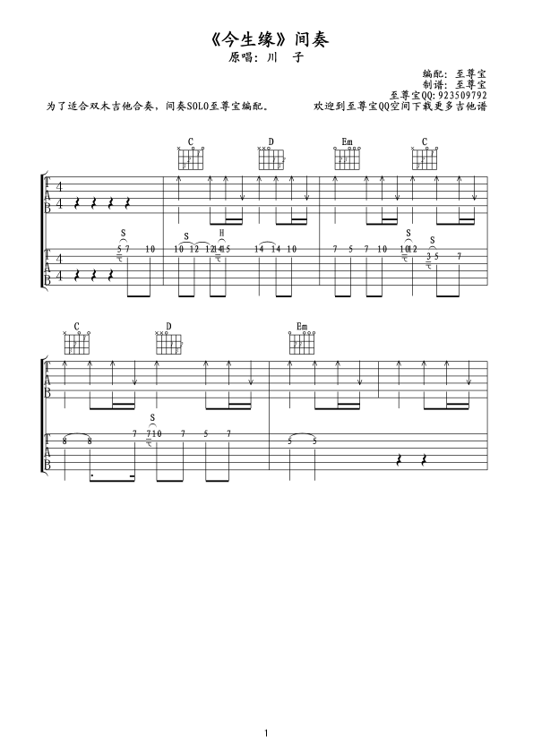 :《今生缘》双吉他合奏谱(高清)吉他谱该歌谱演奏者为川子 ,歌曲名称为今生缘,歌谱类型为。《今生缘》是一首描述朋友感情的歌。感人的旋律中,充满了对过去的怀念和对朋友情谊的珍重。《今生缘》—至尊宝版本吉他谱