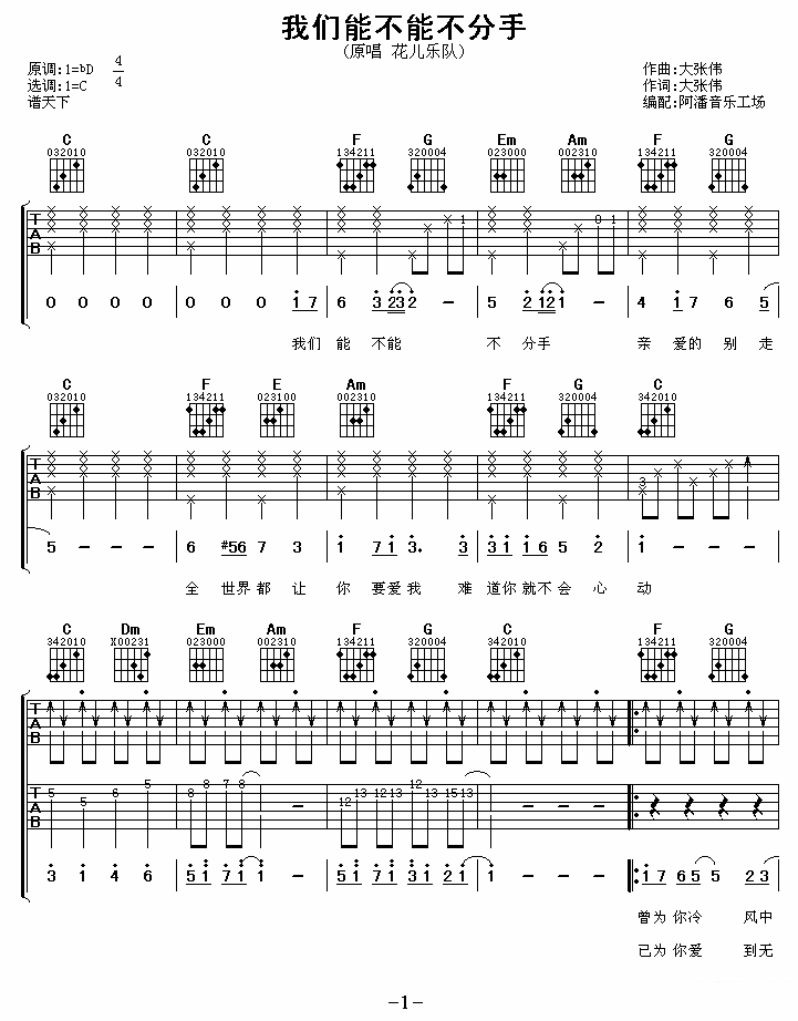 P1:花儿乐队《我们能不能不分手》吉他谱/六线谱(第1页)