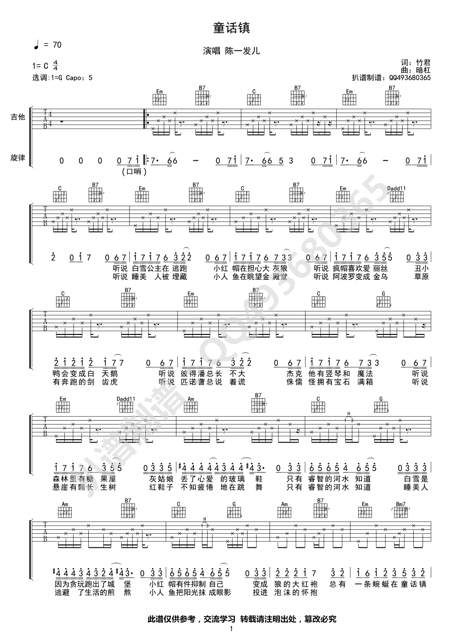 陈一发儿《童话镇》吉他谱,原调C,选调G,变调夹夹五品。童话镇吉他谱,六线谱高清编配,三张图片谱。一首节奏轻快、非常好听的《童话镇》,来自斗鱼直播的发姐陈一发儿。